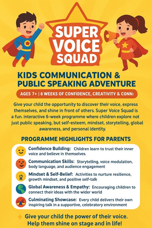 Give your child the opportunity to discover their voice, express themselves, and shine in front of others. Super Voice Squad is a fun, interactive 6-week programme where children explore not just public speaking, but self-esteem, mindset, storytelling, global awareness, and personal identity.